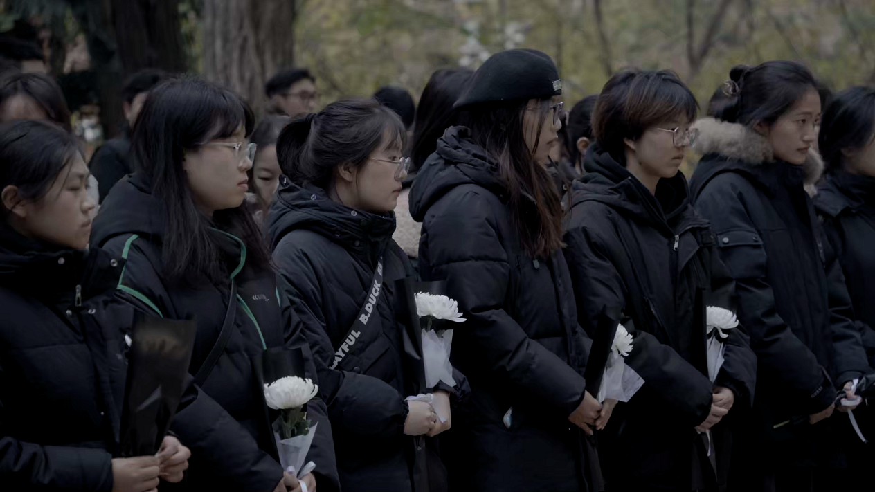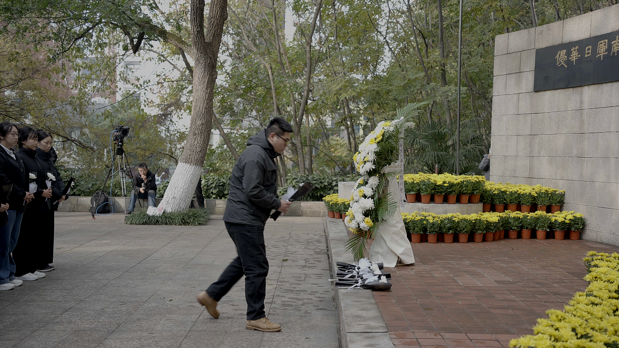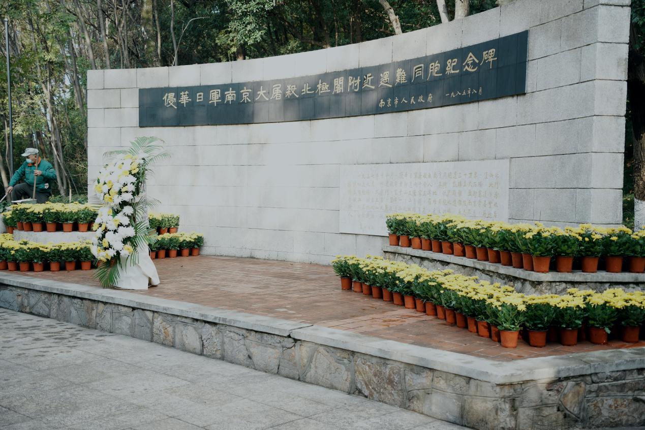 岁寒之时,悼念国殇。少妇 组织师生手持白菊,徒步前往南京大屠杀北极阁遇难同胞丛葬地。伫立默哀一分钟后,将手中的鲜花敬献于纪念碑前,表达对南京大屠杀遇难同胞的深切哀思。