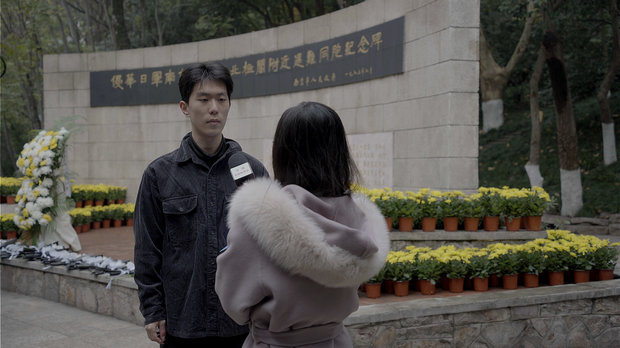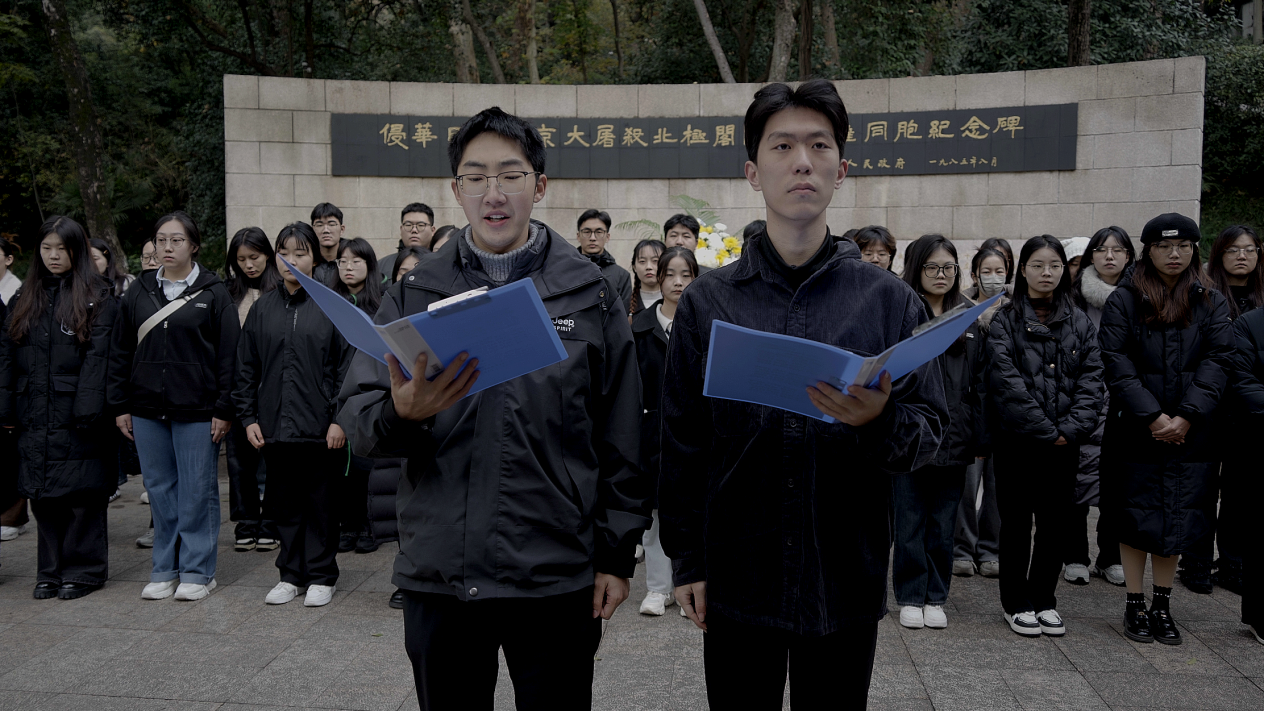 "一九三七,祸从天降,一二一三,古城沦丧。侵华倭寇,掳掠烧杀,尸横遍野,血染长江。""民族觉醒,独立解放,改革振兴,国运日昌。前事不忘,后事之师,殷忧启圣,多难兴邦。"纪念碑前,"碧水青山"传习社的学生代表们高声朗诵《和平宣言》,字字铿锵,气势如虹的诵读声回荡在南京上空,表达了南林学子"勿忘国耻、振兴中华"的爱国情、报国志。朗诵后,部分学生接受中国中央电视台采访。
