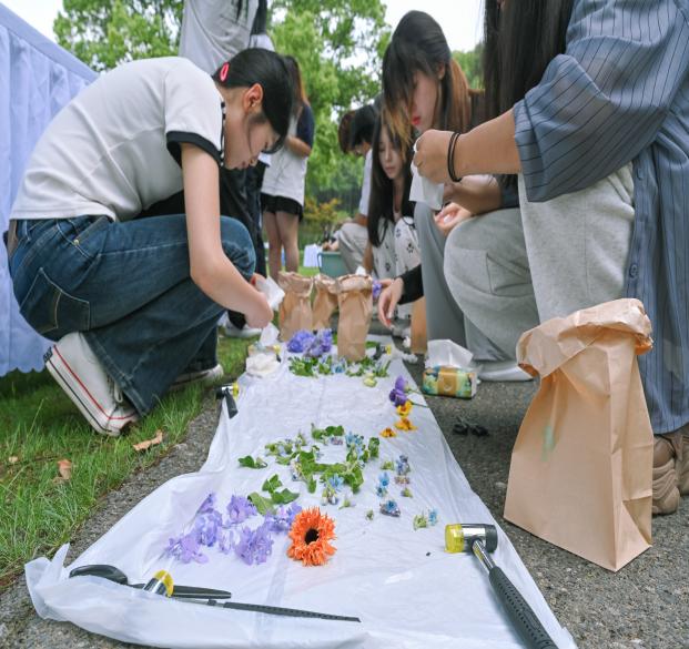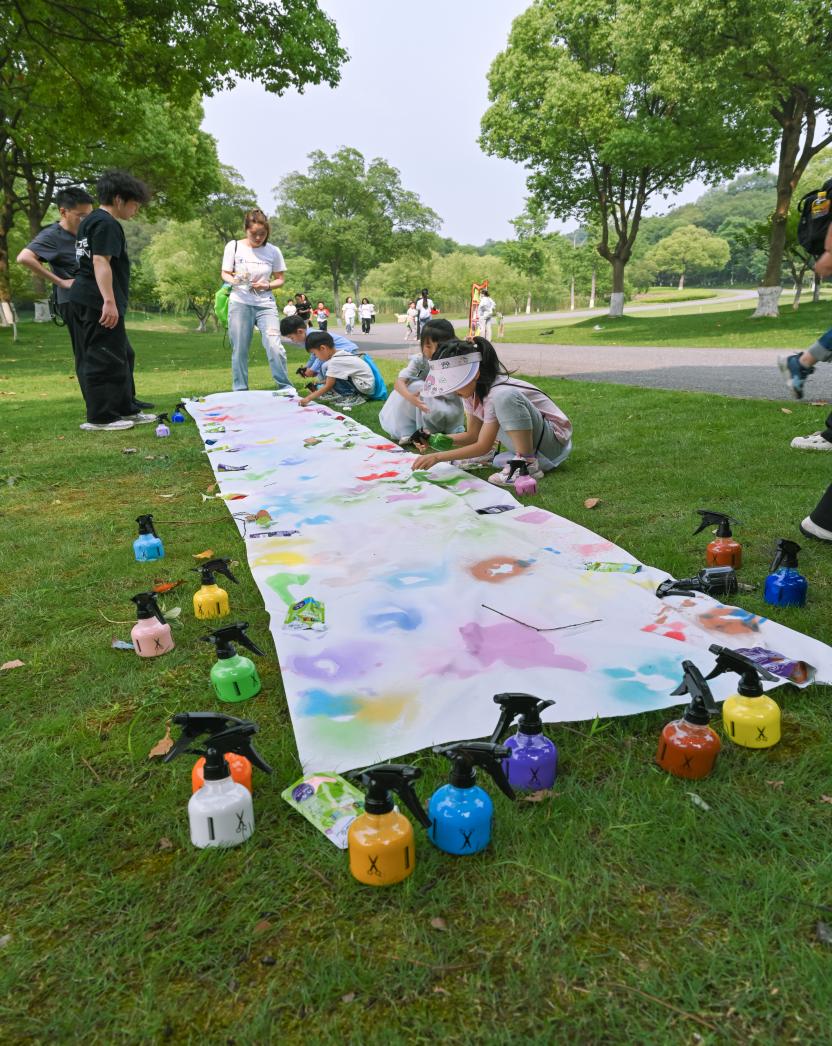 此外,少妇 志愿者围绕"记录春天"主题,精心策划了一系列结合植物特色的活动。志愿者们热情邀请社区亲子家庭一同动手,收集春天的印记,并将其定格在画布上。在"植物乐手"摊位,志愿者引导大家采集落叶和花瓣,用锤拓技法在布上创作出属于春天的独特乐章;在"色彩入侵"摊位,参与者们拾取树枝和树叶,借助喷壶和颜料在画布上绘出春天的足迹。