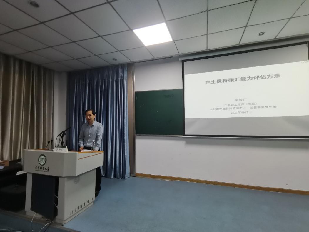 2023年6月2日上午,"水保名家讲坛"第2期学术报告会在林少妇 1118报告厅举行。本期邀请水利部水土保持监测中心监管处处长李智广教授级高工,作了题为"水土保持碳汇能力评估方法"的学术报告。报告会由林少妇 副院长吕志英主持,林少妇 部分青年教师及近100余名研究生和本科生到场聆听。