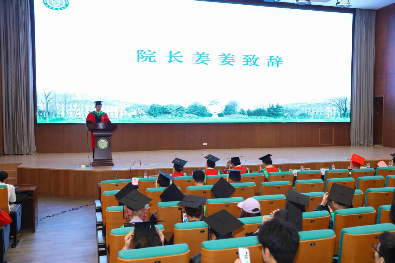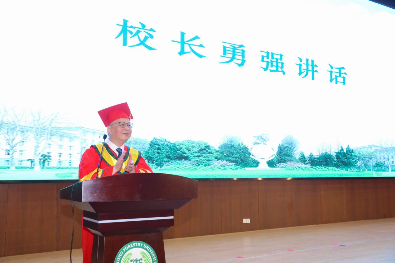 典礼在庄严的国歌声中拉开帷幕,姜姜院长致辞勉励在场所有毕业生,他希望毕业生们能够敢想敢为,不断锤炼自身本领,担当使命,始终秉承"诚朴雄伟,树木树人"的校训,把论文写在祖国大地之上,带着林业人的烙印奔赴山海。