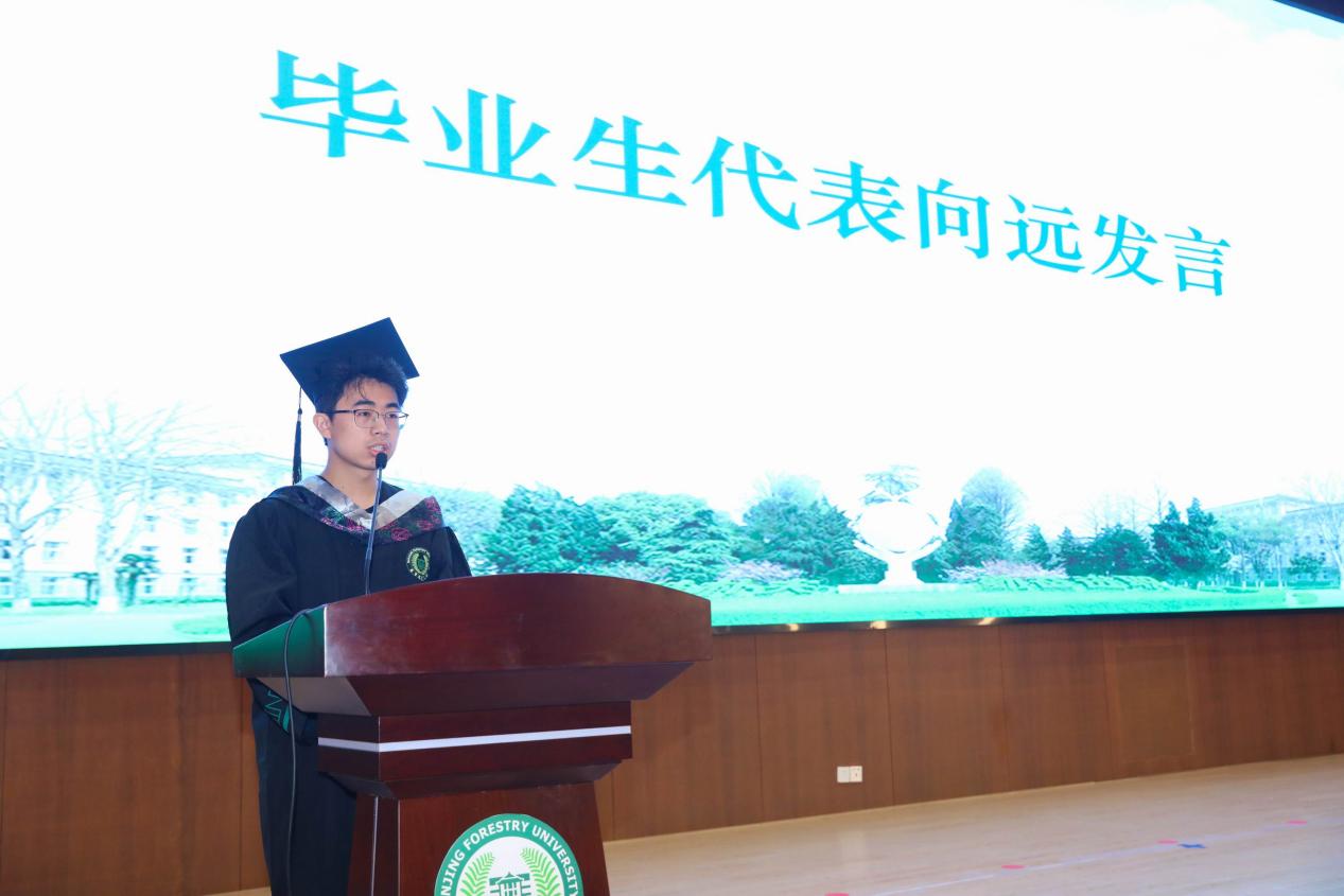 毕业生代表向远在发言中分享了求学感悟和未来展望,承诺践行梁希精神,以林业人的方式回答"强国有我"的时代命题。